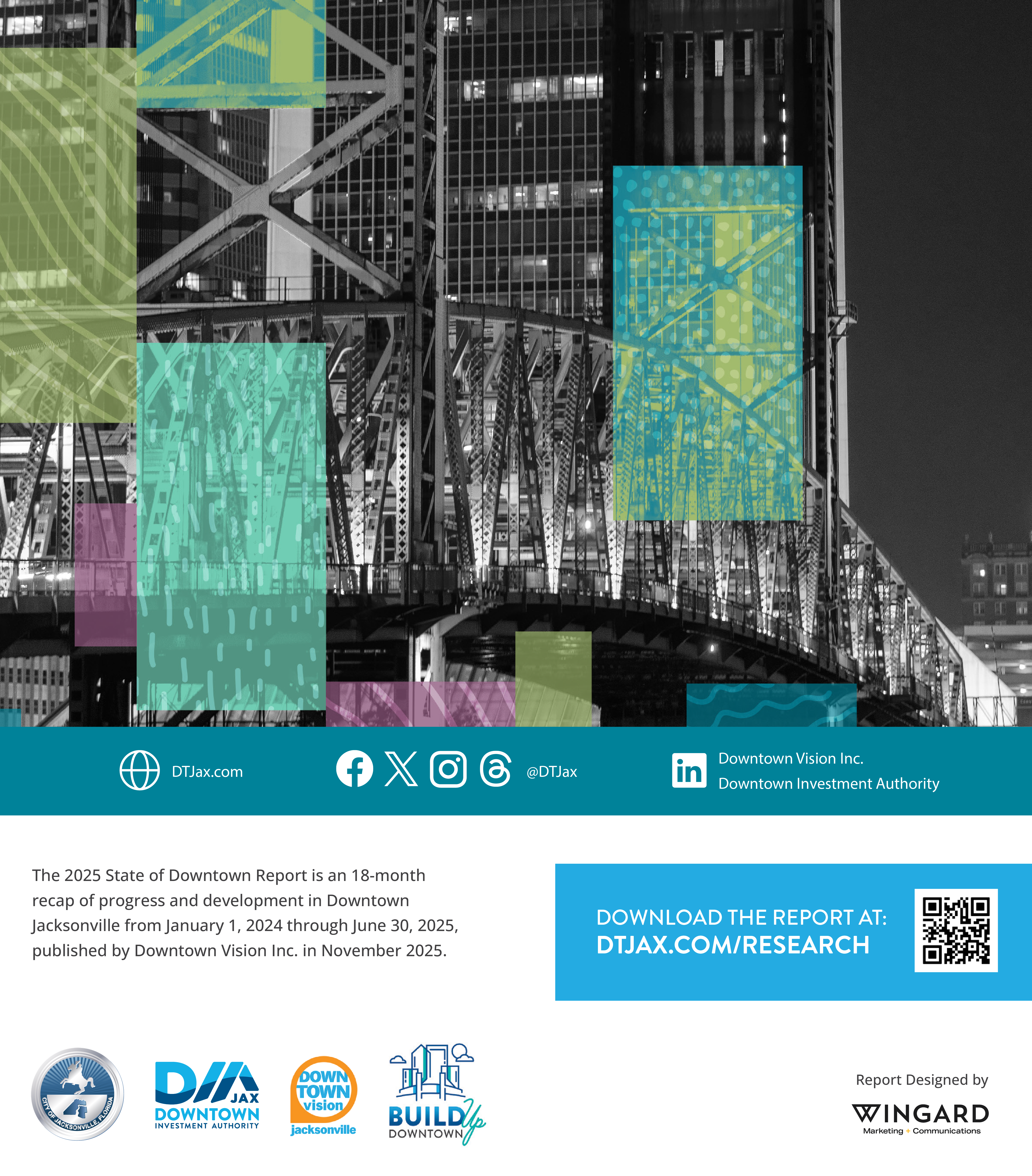 The 2025 State of Downtown Report is an 18-month recap of progress and development in Downtown Jacksonville from January 1, 2024 through June 30, 2025, published by Downtown Vision in November 2025.