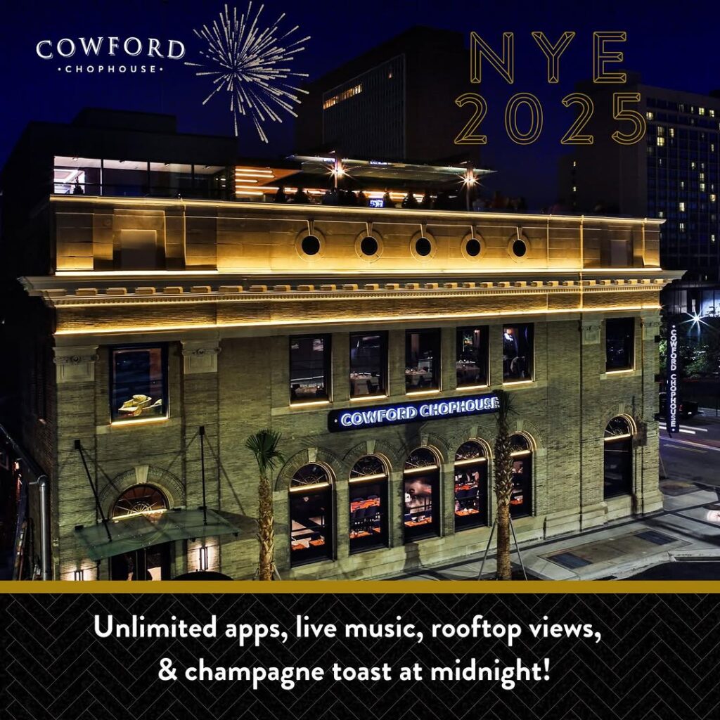 Ring in the New Year above the city at Cowford Chophouse’s rooftop NYE celebration. From 9 p.m. to midnight, guests will enjoy live music, sweeping Downtown views and fireworks, plus a premium open bar featuring G.H. Mumm Champagne, Angel’s Envy, Patrón and Grey Goose, delicious appetizers and a complimentary glass of bubbles at midnight. A portion of each ticket supports the Jacksonville Art & Music School for a celebration that gives back.