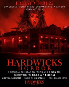🕯️THE HARDWICKS HORROR takes over next Friday, Oct 31—and we’re closing out the month with a birthday bash from beyond the grave 💀. We’re celebrating @trknudson and @shes.amanduh with a night of costumes, chaos, and performances that slay. 👻 We’ll have music by @nickfreshalive keeping the dance floor alive, while @darnellmua_divacliche , @geiovan_cliche , @la_fiercebeat […]