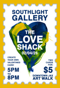 Happy Valentines Day from Southlight Gallery! Join us next month for an evening of art and entertainment during February Art Walk in Downtown Jax. We will be hosting a Valentines Card Printing activity using hand carved stamps, fun for all ages. At just $5, you will receive two blank cards to print and leave with […]