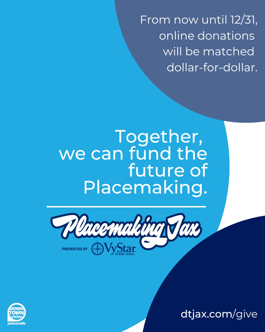 This holiday season, we invite you to support Downtown Vision’s mission to create and support a vibrant Downtown Jacksonville. From November 1 to December 31, your online donation to PlacemakingJax will be matched dollar-for-dollar by the Jessie Ball duPont Fund—doubling your impact to help residents transform public spaces into vibrant community places.