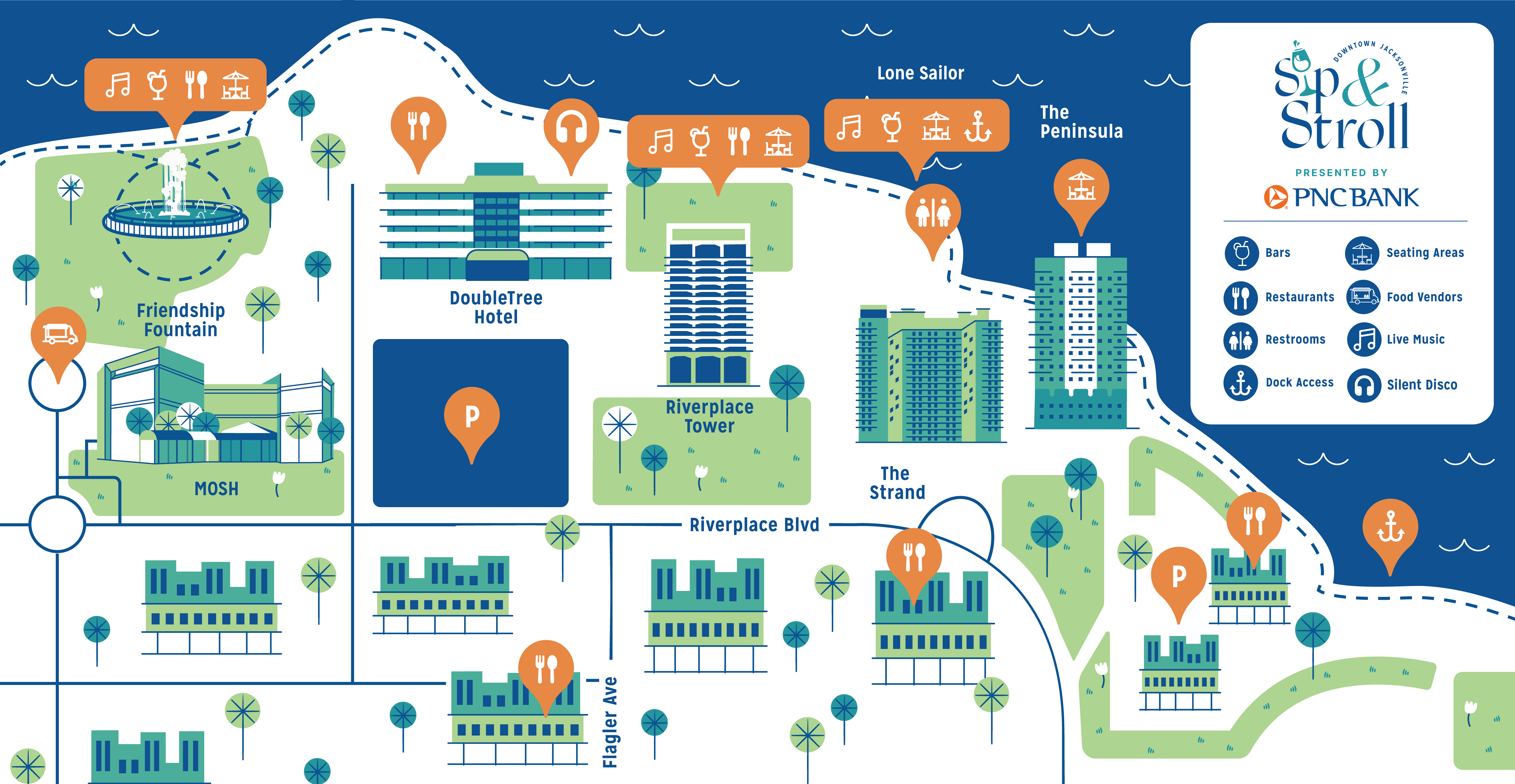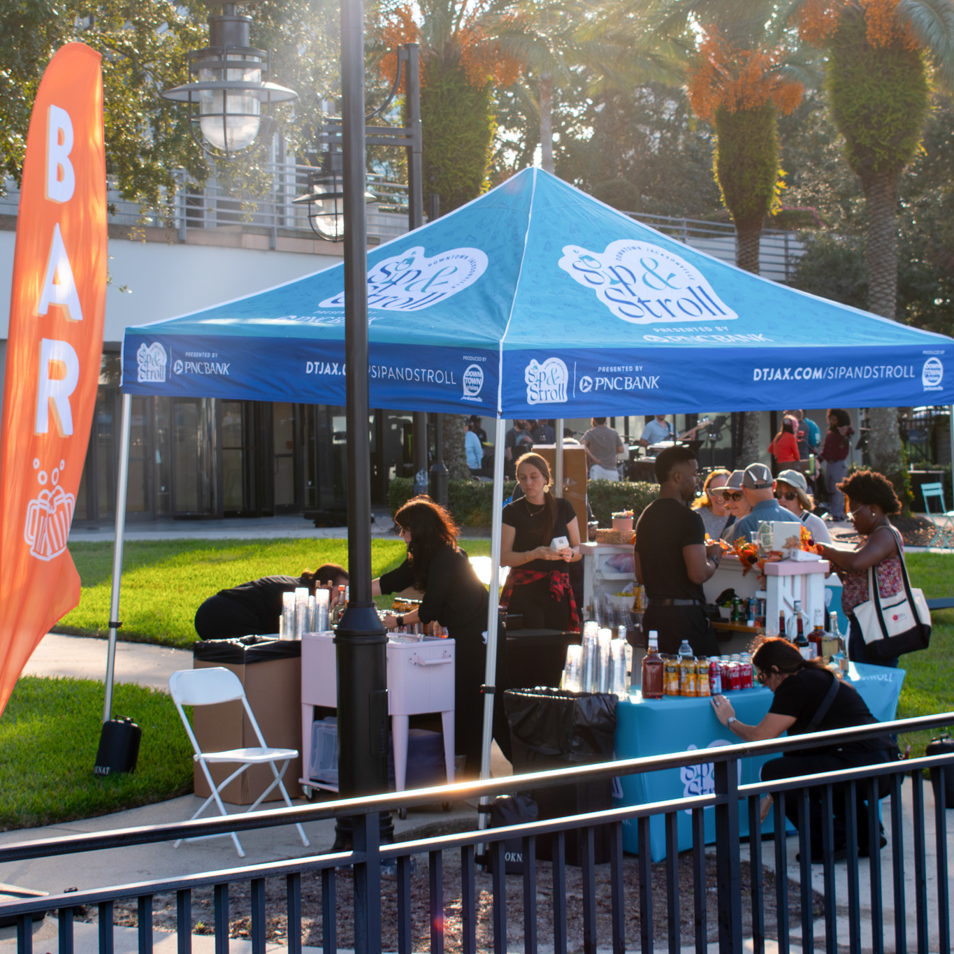 Alcoholic beverages in branded Sip & Stroll cups are permitted during the event and can be purchased at either of the Riverwalk bars.